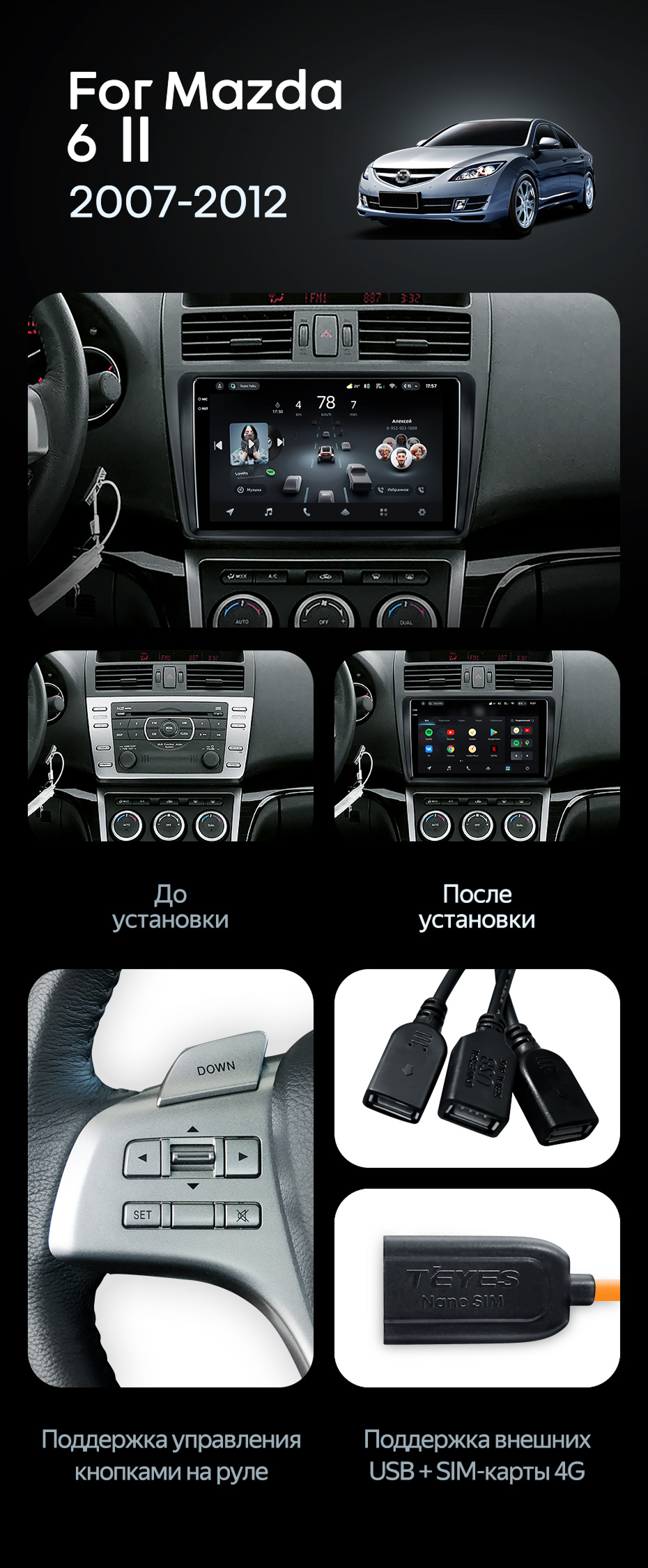 Штатная магнитола Teyes CC4 Pro 12/256 Mazda 6 2 GH (2007-2012) - купить всего за 66 230 руб. в интернет-магазине во Владимире Teyes.com.ru. ✓ Самый лучший выбор мультимедиа ✓ Лучшая замена штатному ГУ ✓ Тел. +7 (800) 775-31-74