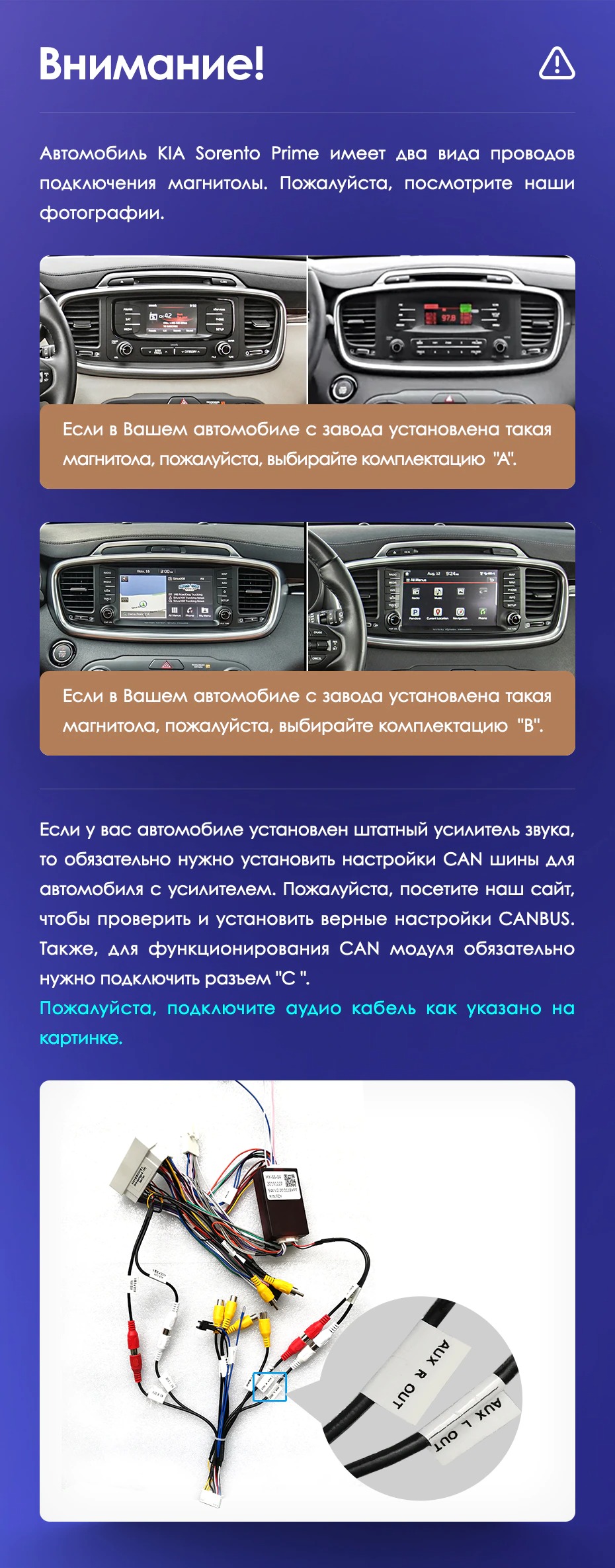 Установочный комплект для Kia Sorento 3 Prime (2014-2017) включает переходную рамку и проводку.