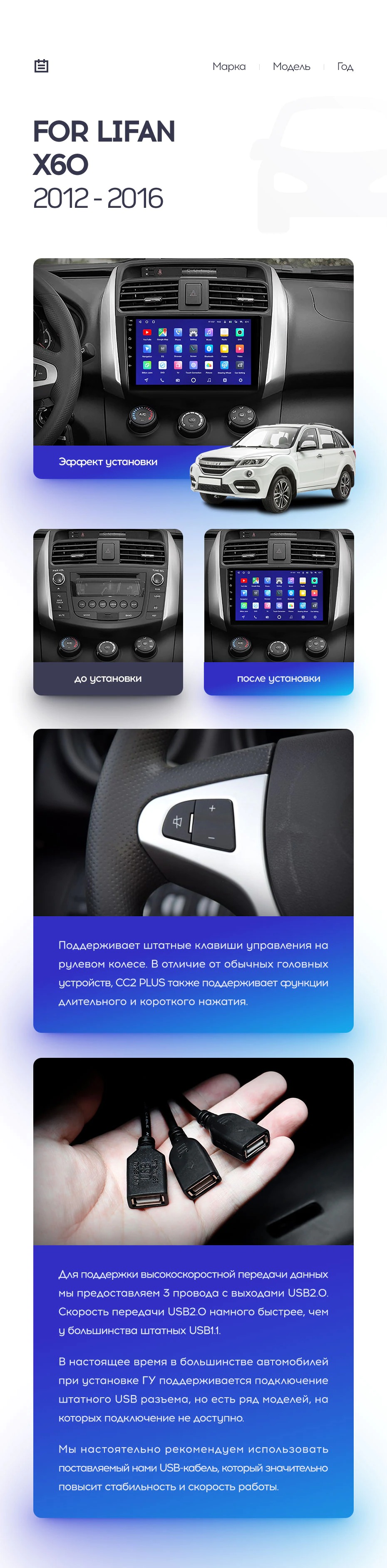 Полный комплект установки магнитолы Teyes с рамкой и проводкой можно выбрать в каталоге штатных магнитол Lifan X60 (2012-2018).