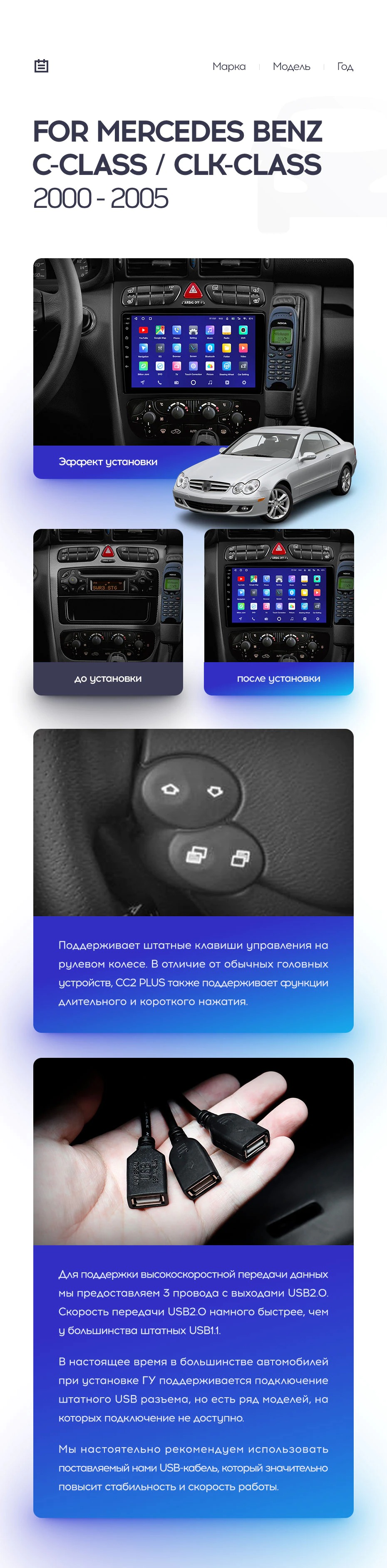 Установочный комплект для Mercedes Benz C/CLK Class S203 W203 W209 A209 (2000-2005) включает переходную рамку и проводку.