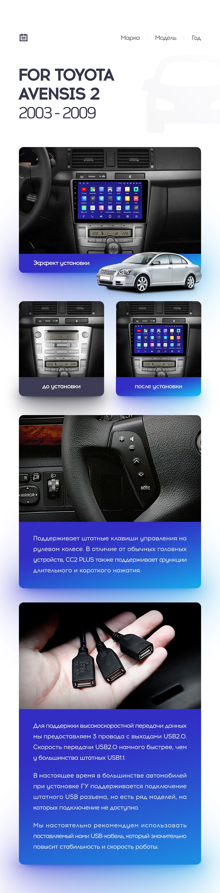 Полный комплект установки магнитолы Teyes с рамкой и проводкой можно выбрать в каталоге штатных магнитол Toyota Avensis T250 (2003-2009).