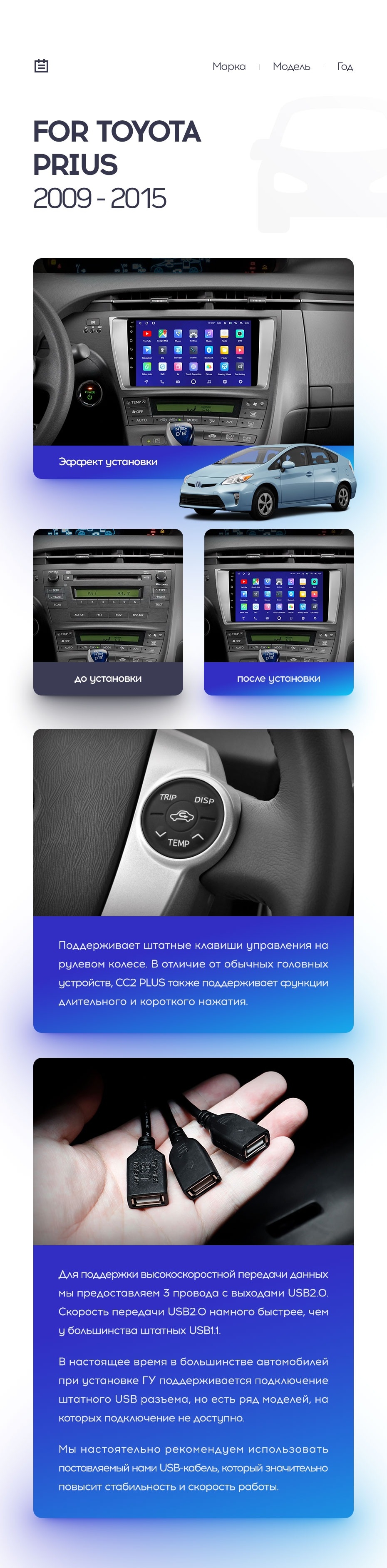 Полный комплект установки магнитолы Teyes с рамкой и проводкой можно выбрать в каталоге штатных магнитол Toyota Prius XW30 (2009-2015).