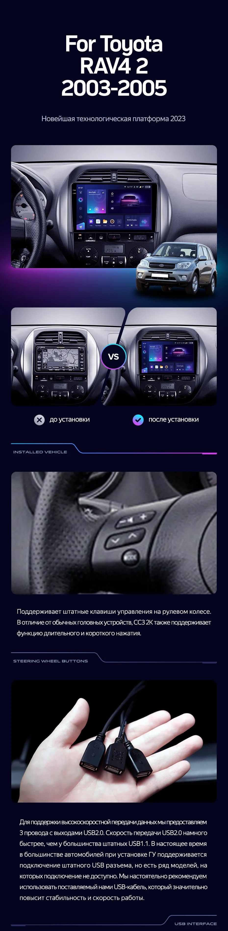 Полный комплект установки магнитолы Teyes с рамкой и проводкой можно выбрать в каталоге штатных магнитол Toyota RAV4 2 CA20 CA20W XA20 (2003-2005).