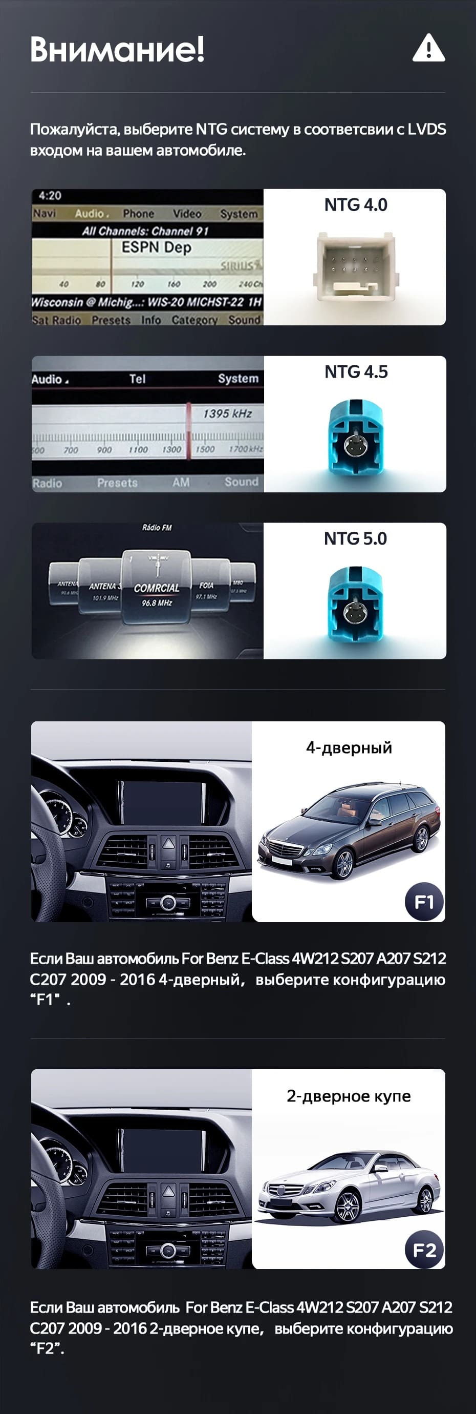 Установочный комплект для Mercedes-Benz E-Class 4 W212 S207 A207 S212 C207 (NTG 4.0) (2009-2016) включает переходную рамку и проводку.